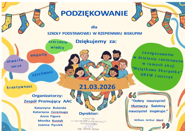 Nasza szkoła wzięła udział w Akcji ,, Wyjątkowa Skarpetka”. Przez kolejne tygodnie przeprowadzono zajęcia w klasach I-VIII na temat Zespołu Downa, Życzliwości i Empatii. W ostatnim tygodniu uczniowie wraz z nauczycielami w kreatywny sposób ozdobili swoje skarpetki nie do pary. Każda była inna i wyjątkowa. Na zakończenie akcji uczniowie przywiesili swoje skarpetki na sznurku i […]