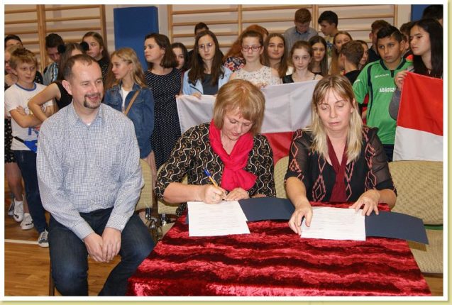 W czwartek 28 listopada 2019r. do naszej szkoły przyjechali goście ze Szkoły Podstawowej z Abádszalok z Węgier. Wzięli oni udział w wieczorze andrzejkowym podczas którego zapoznali się z przykładowymi wróżbami. Wspólnie z uczniami z naszej szkoły zatańczyli kilka tańców towarzyskich oraz rozegrali towarzyski mecz piłki nożnej. Najważniejszym elementem ich wizyty było podpisanie umowy partnerskiej.