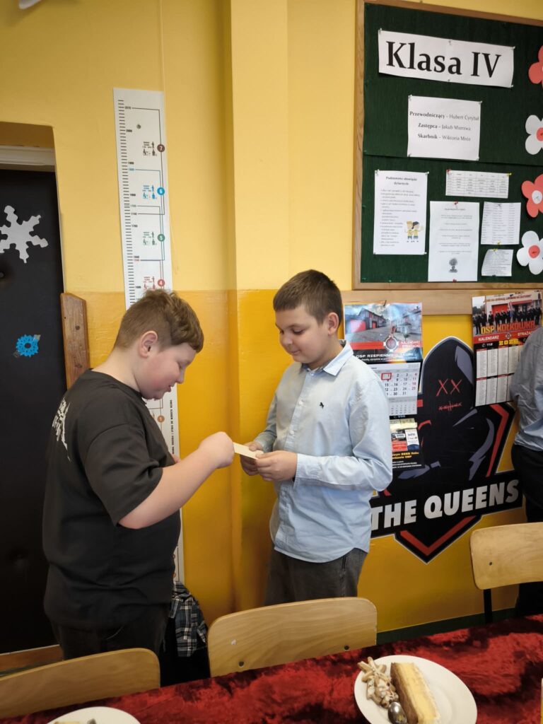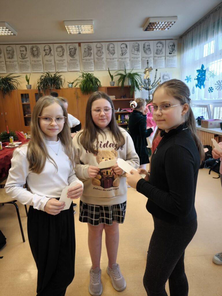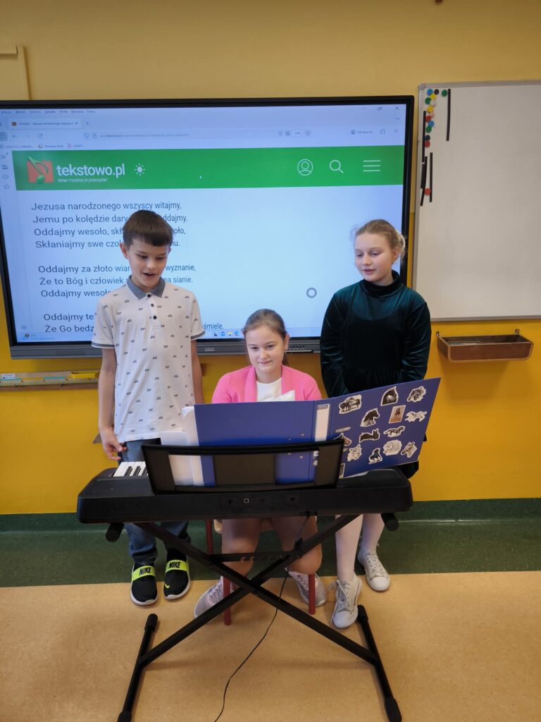 Przed podzieleniem się opłatkiem odbyła się wspólna modlitwa oraz odczytanie fragmentu Pisma Świętego, co pomogło wszystkim zatrzymać się na chwilę refleksji i zrozumieć prawdziwy sens Świąt Bożego Narodzenia. Następnie uczniowie złożyli sobie ciepłe i serdeczne życzenia. Wyjątkowym momentem spotkania był występ jednej z uczennic, która zagrała kolędy na keyboardzie, a cała klasa wspólnie je śpiewała.